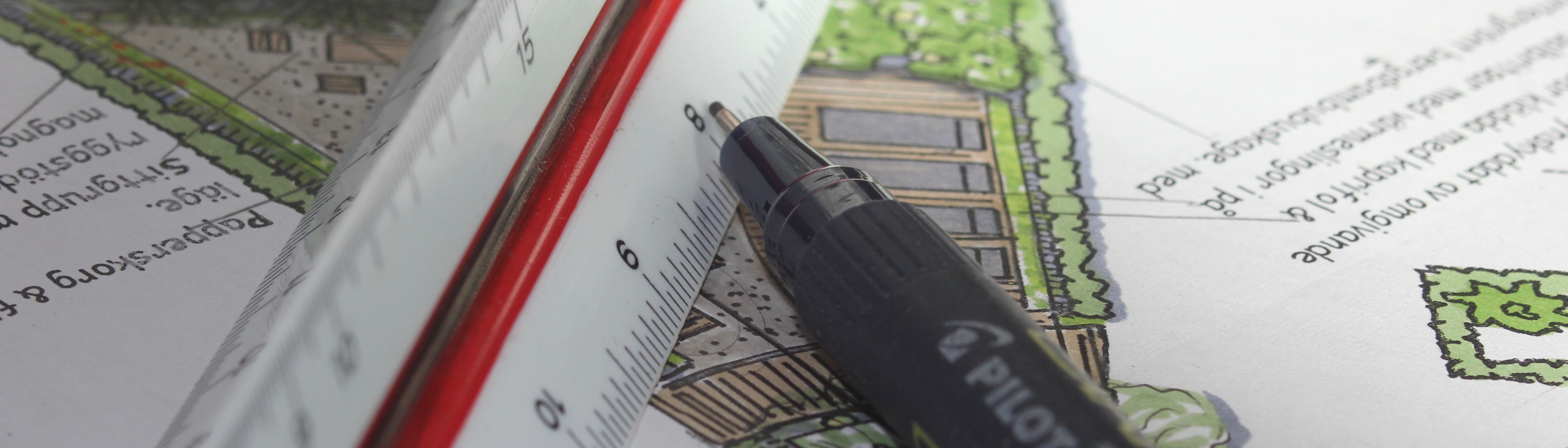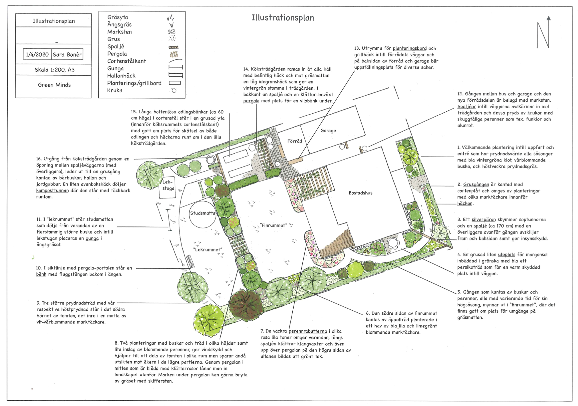 En helt tom och plan trädgård intill en åker. Kunden vill ha kvar utsikt mot åkern men ändå få ombonat med olika trädgårdsrum och flera sittplatser i olika vädersträck. Plats för lek och köksträdgård fanns också med bland kundens önskemål. Allt har delats in i olika rum med hjälp av bla vintergröna stommar, perenn, busk och trädplanteringar och en del snickeridetaljer som pergola och spaljéer.