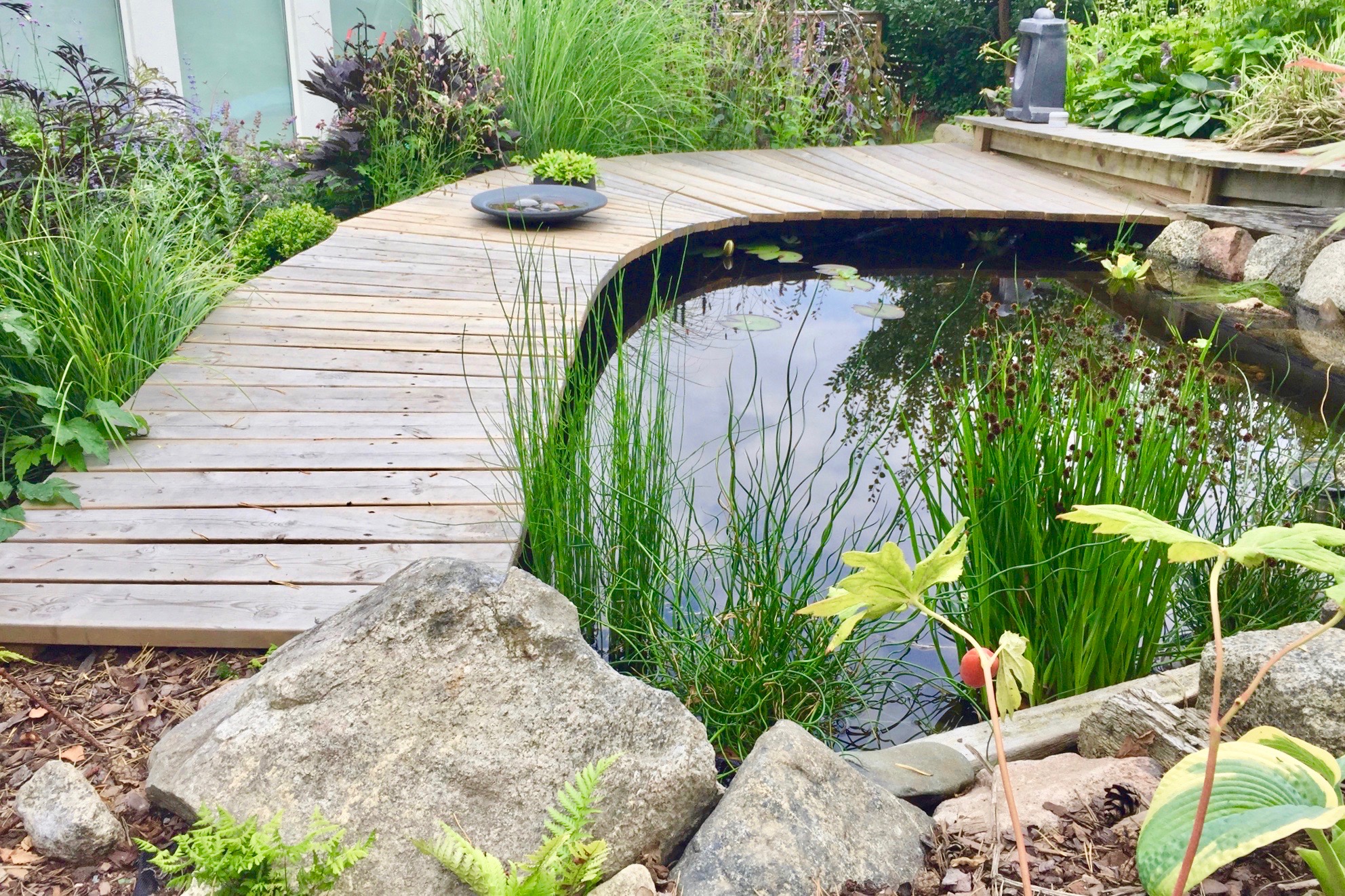Växterna runt om är planterade för att åstadkomma en lummig grön miljö och en inramning åt dammen utan att ta focus ifrån den.