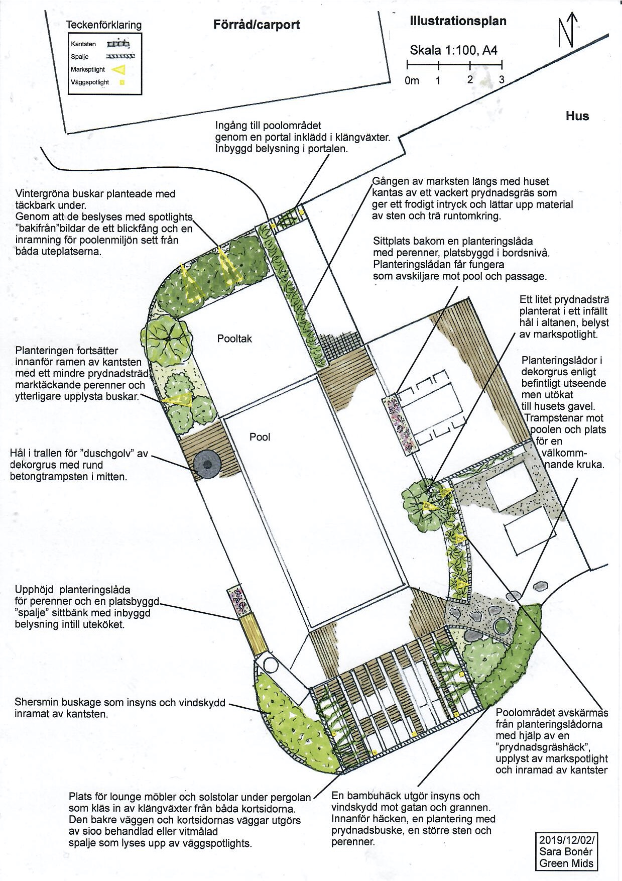 Kunden har en stor tomt med mycket gräsmatta. De vill ha pool men behöver hjälp att få till en trivsam miljö runtom. Här blir det planteringar, med bland annat prydnadsgräs och generösa sittplatser, som är öppna men ändå avskilda från varandra. Gott om insynsskydd.