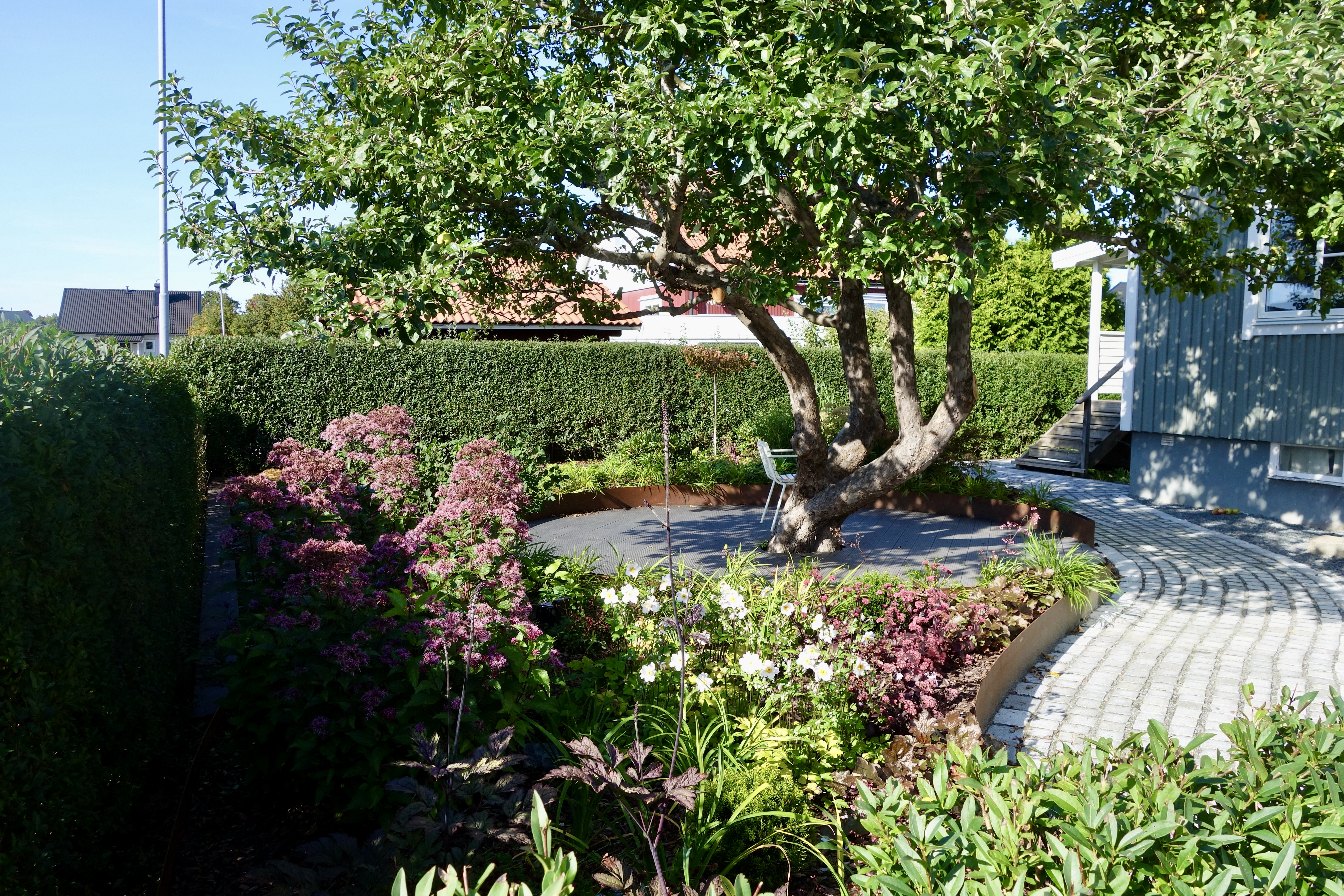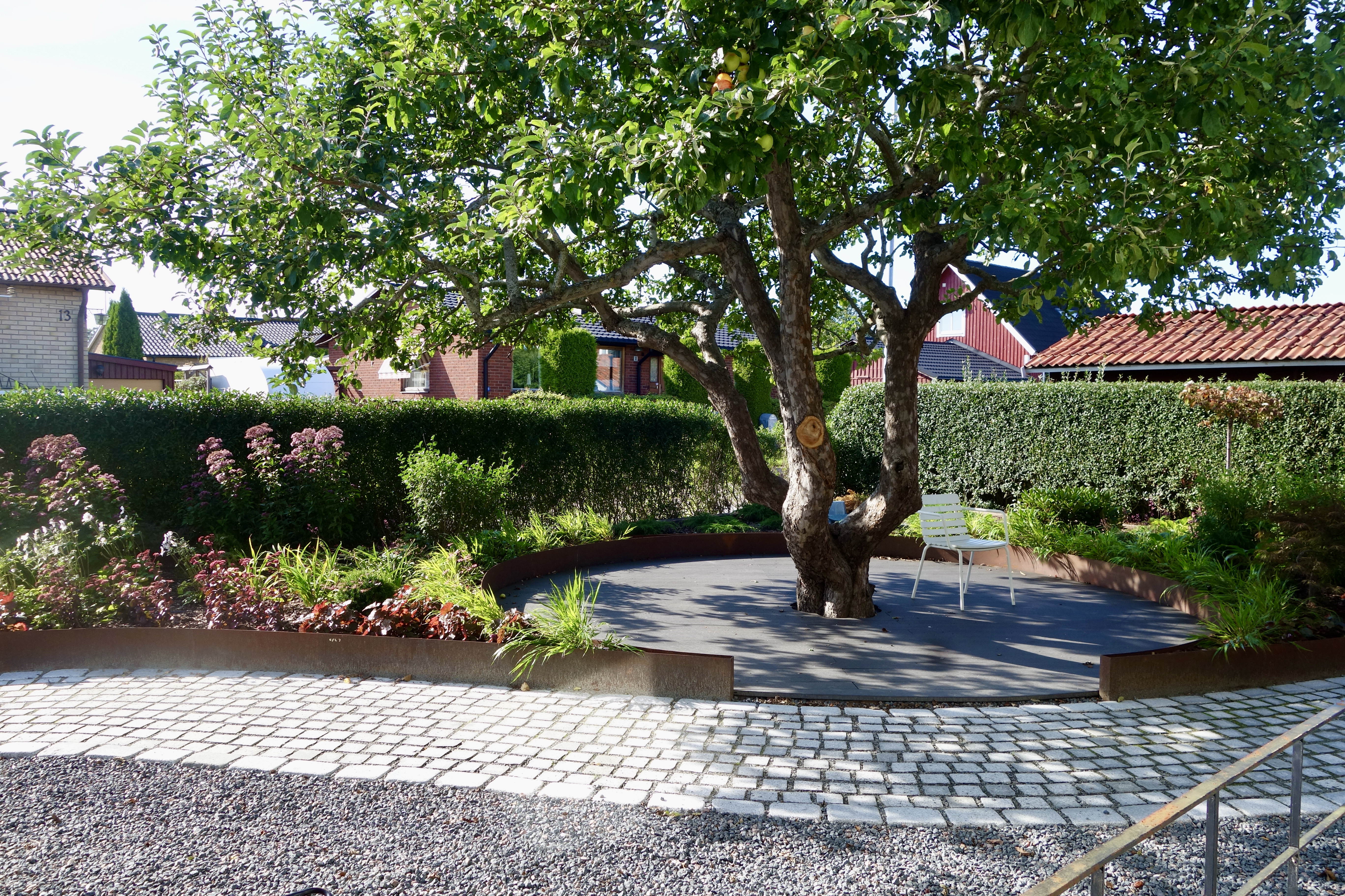 I mitten fick det vackra äppelträdet vara kvar och utgöra lite skugga vid den nya sittplatsen.