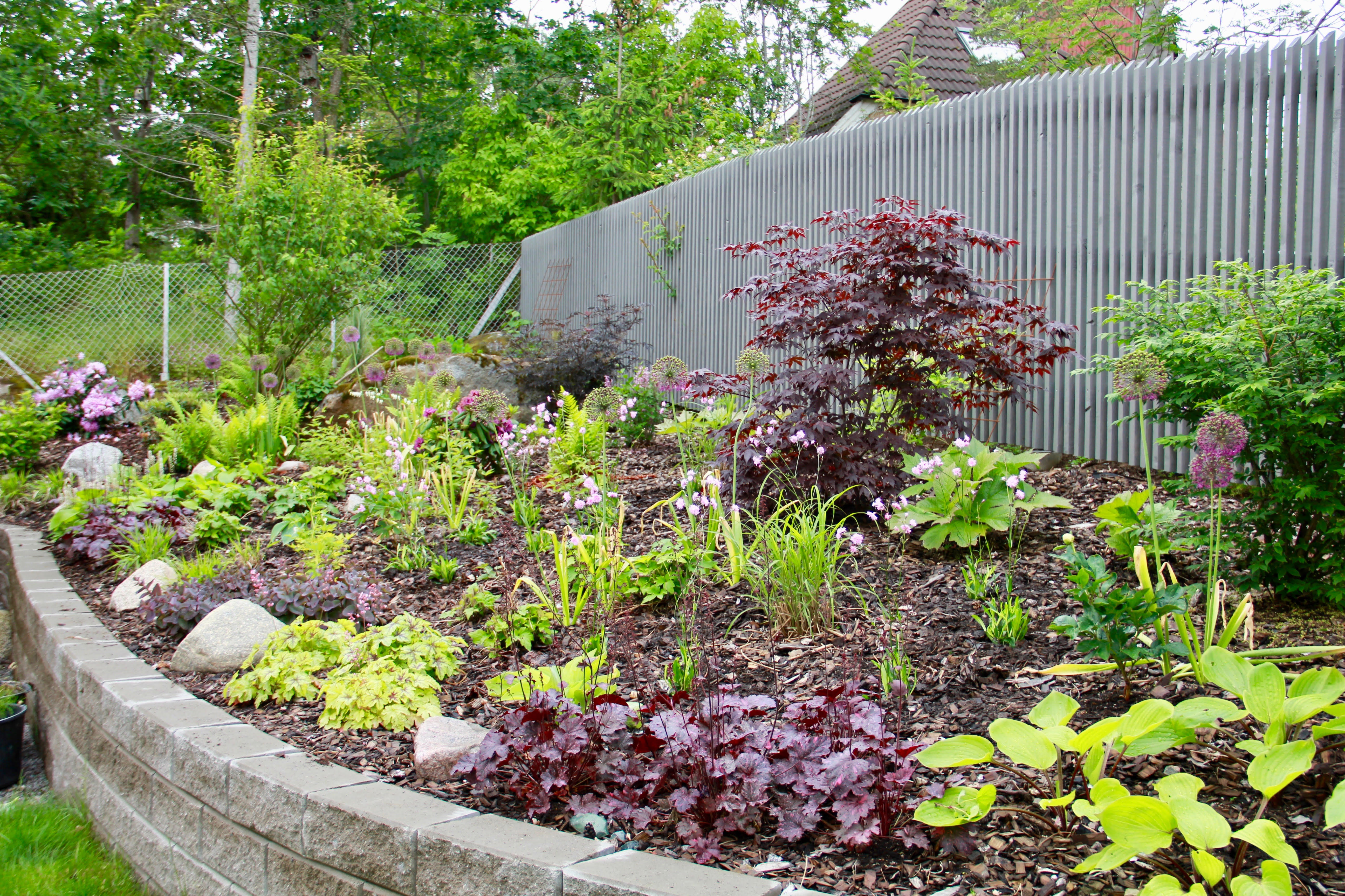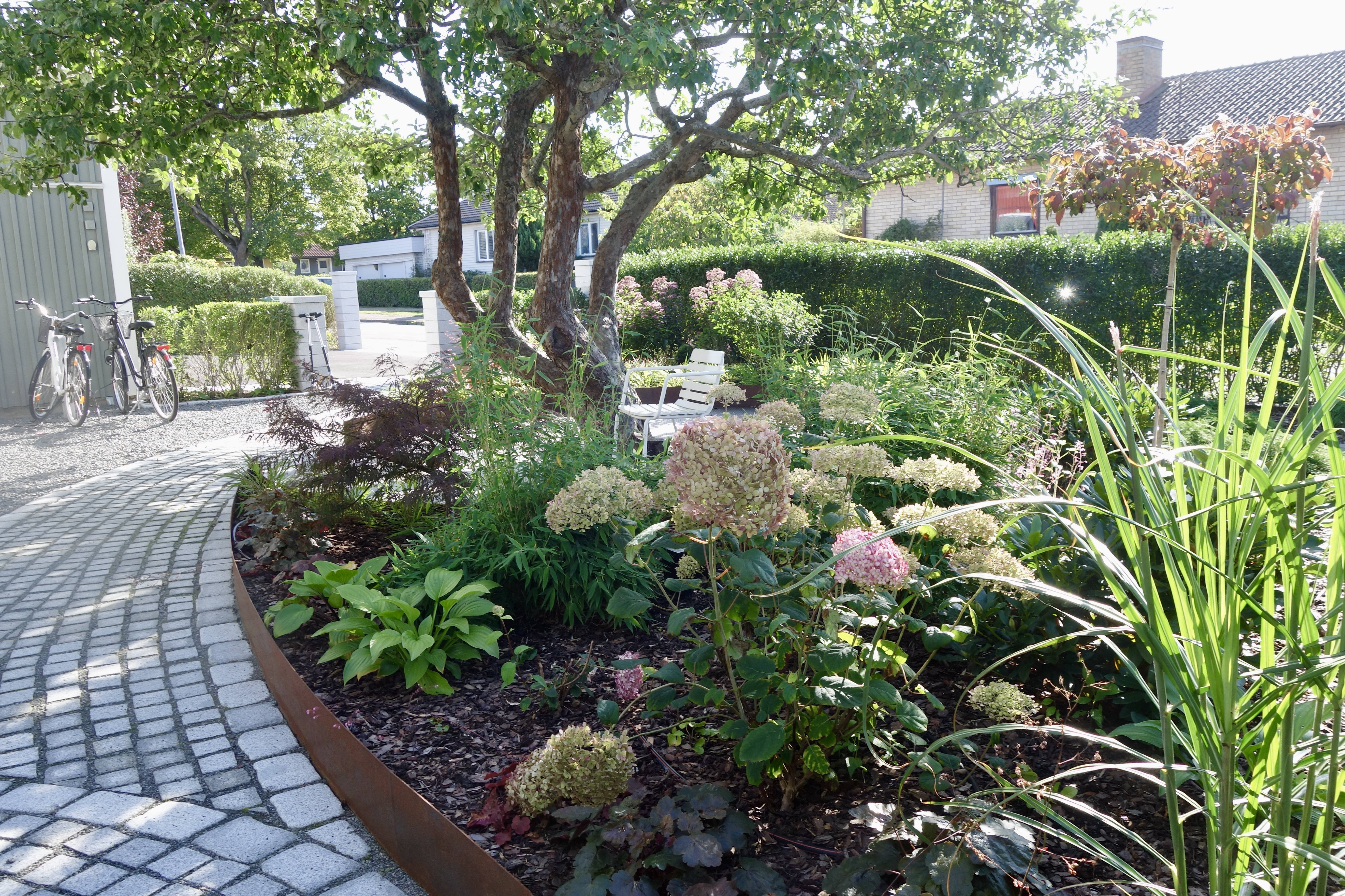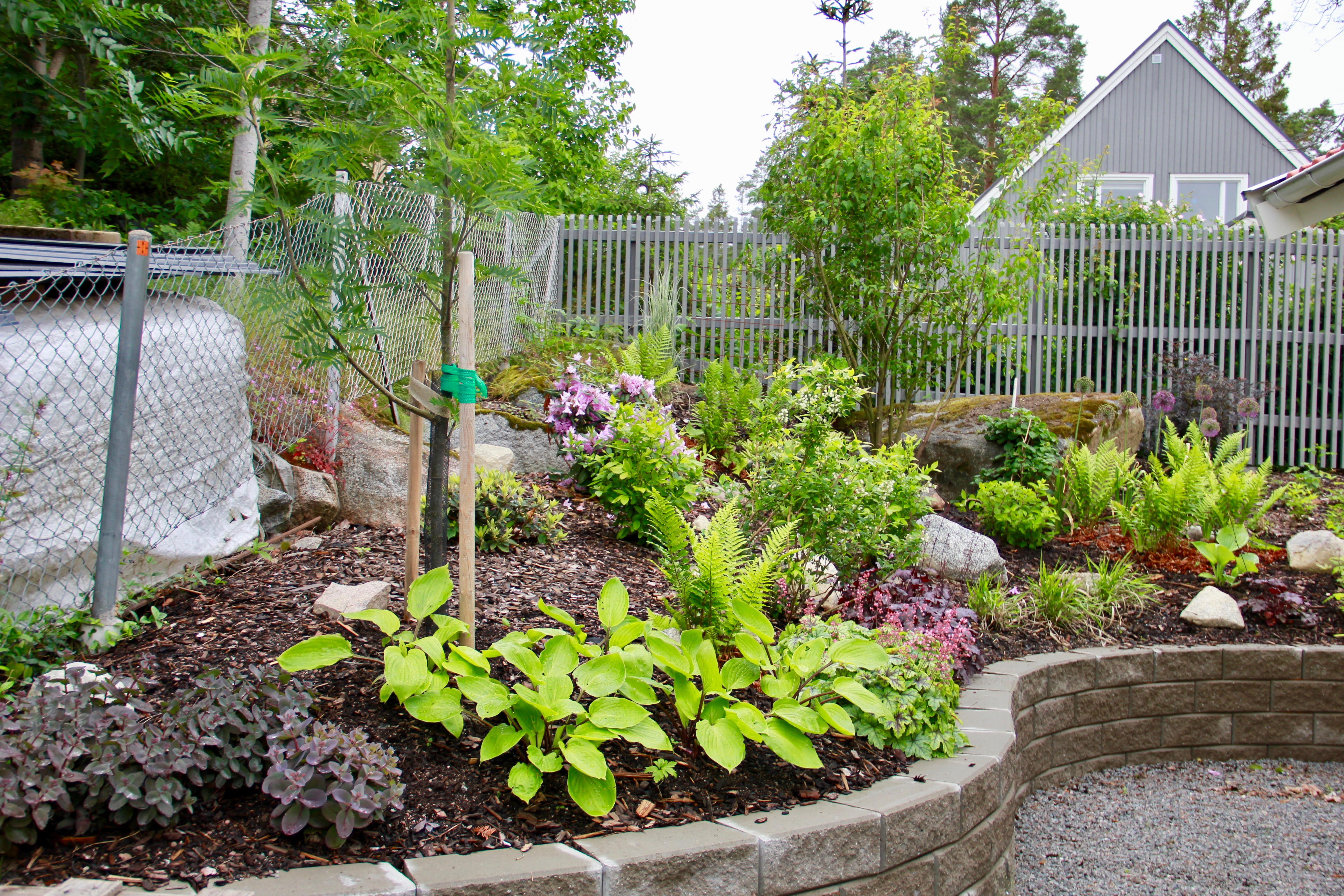 Buskar, träd, och perenner samsas i denna lättskötta rabatt som vuxit ihop fint endast någon månad efter planteringen.