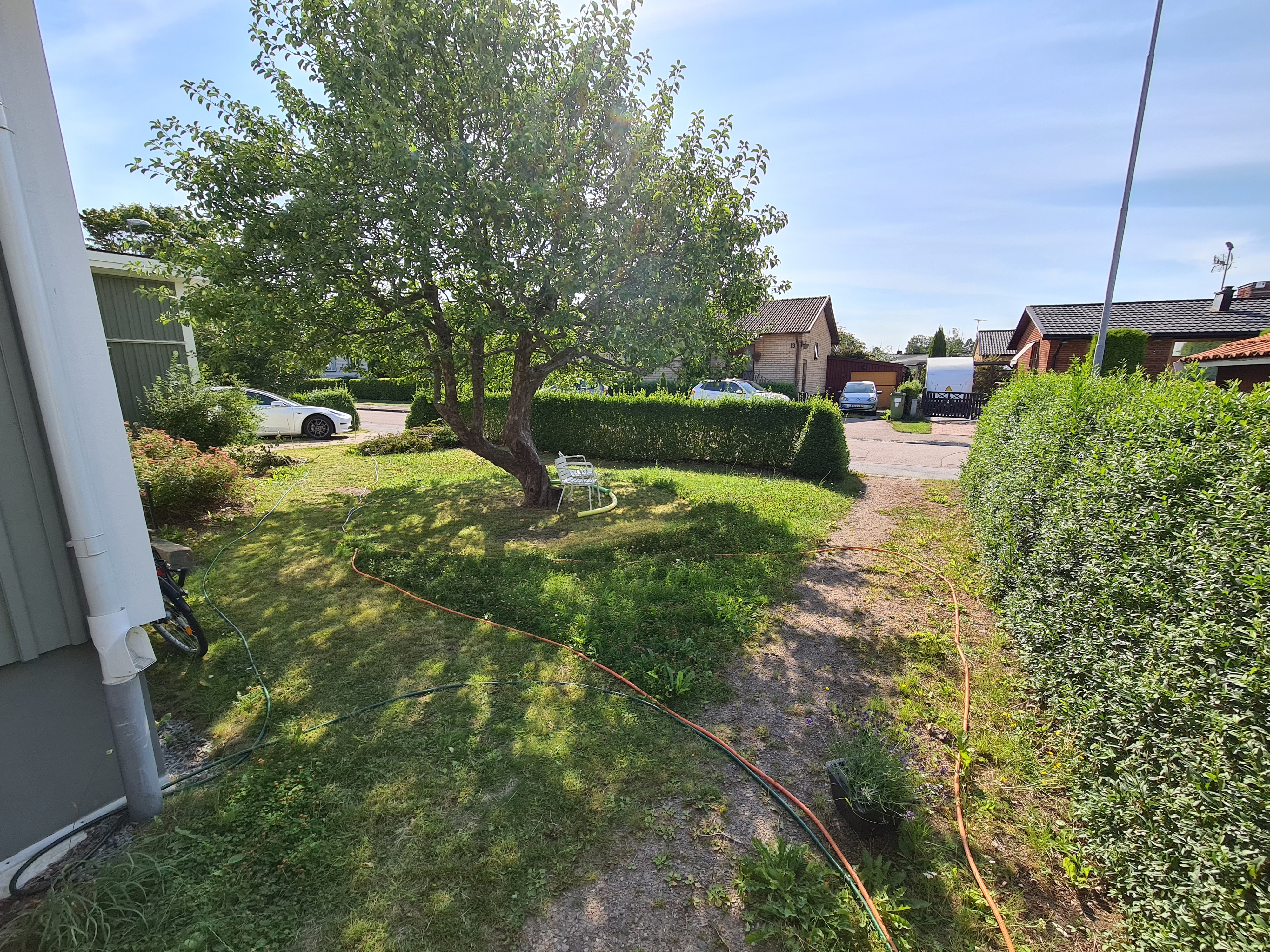 Detta visar entrésidan FÖRE omarbetningen. En tidigare lite bortglömd framsida med gräsmatta och ett gammalt äppelträd som kunden var osäker på om det skulle få vara kvar eller ej.