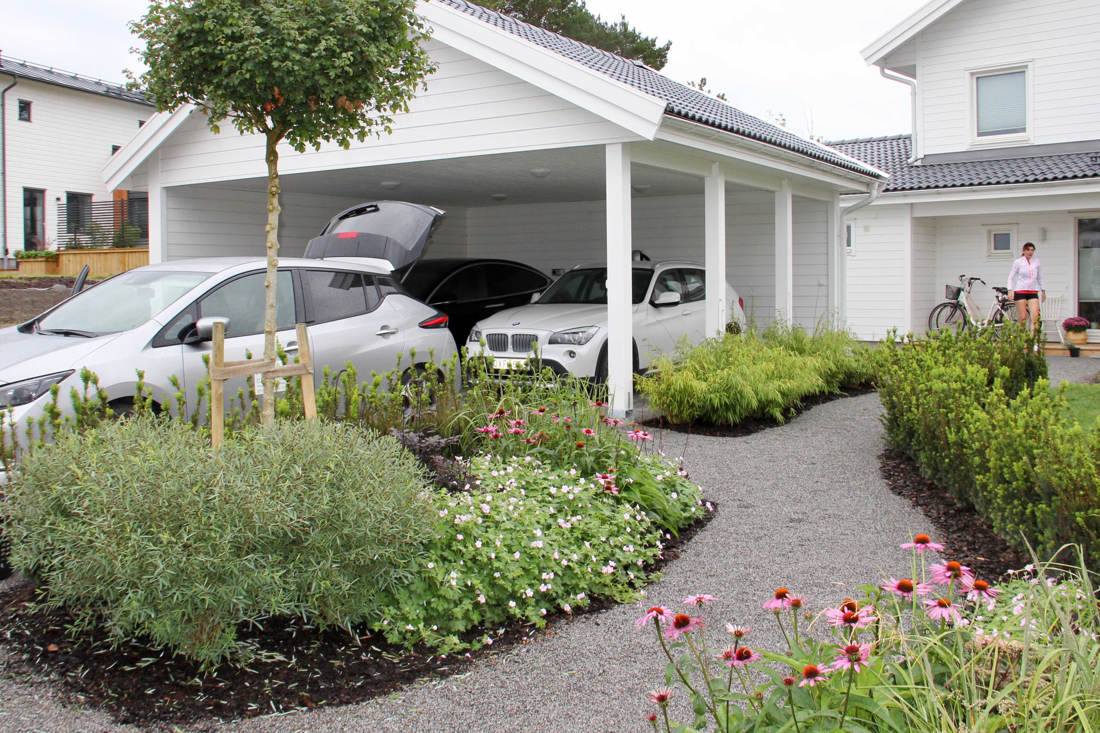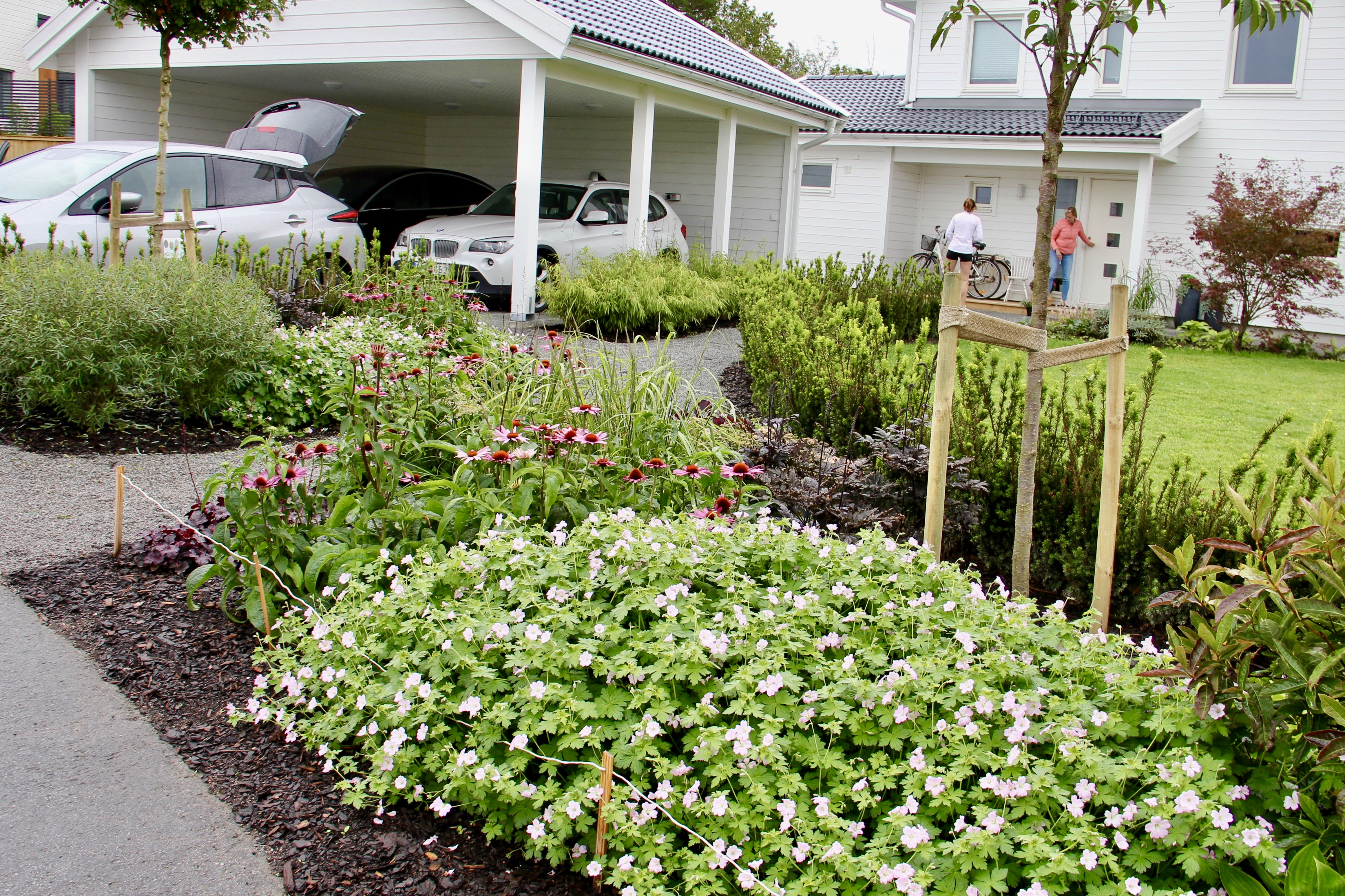 Här har den nybyggda fastigheten fått en välkomnande entréplantering.